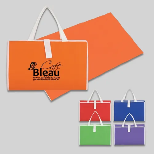 Features Made Of 80 Gram, Non-Woven Coated Water-Resistant Polypropylene. 32" W x 63" L Beach Mat. 11-1/2" Carrying Handles. Easily Folds Into A Self Contained Carrying Case. Snap Closure. Water And Sand Resistant.